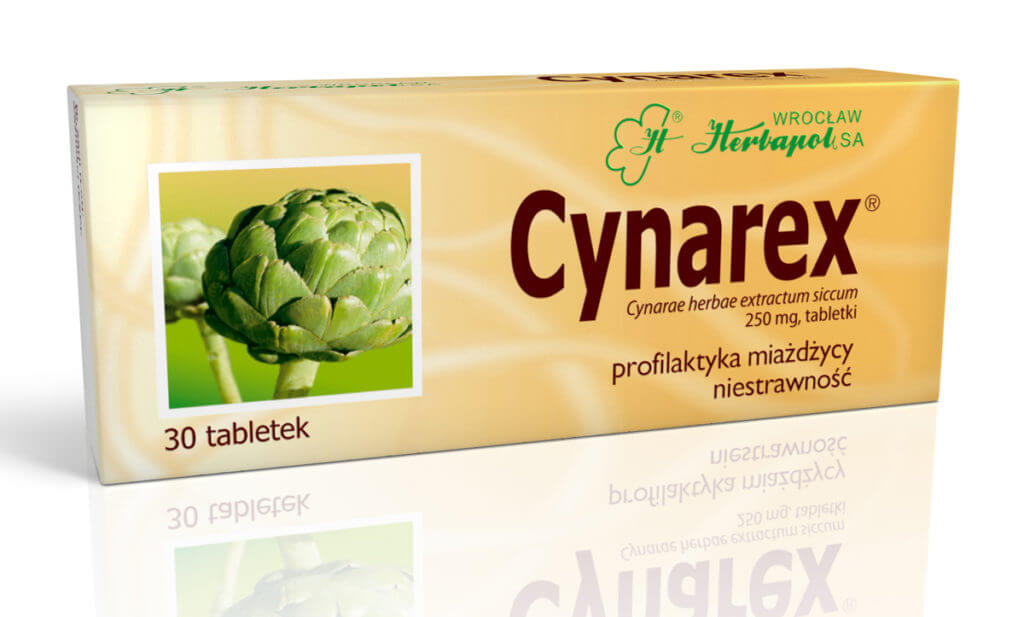 tabletki, lek bez receptyCynarex® stosuje się pomocniczo w hipercholesterolemii jako środek obniżający poziom cholesterolu i trójglicerydów w surowicy krwi (profilaktyka miażdżycy) oraz tradycyjnie w niestrawności.